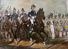 Having defeated von Rosen at Międzyrzec on 29 August, Ramorino's forces were ordered to return to Siedlce, but Ramorino disregarded that order and followed von Rosen towards Brześć.[41] The order to return through Łuków to Siedlce was repeated on 4 September. From there, a forced march could allow the II Corps to cross the Vistula to the south of Warsaw and attack Paskevich from the rear,[42] or rejoin the bulk of the Polish Army defending Warsaw.[41] The repeated order was also ignored.[41] A large part of the Polish forces, composed mostly of seasoned soldiers, high in morale thanks to recent victories, was wandering aimlessly through Podlasie, only a couple of days' march from Warsaw.[42] Instead of coming to the aid of Warsaw or following the fleeing forces of von Rosen, Ramorino waited in Podlasie for a week, and then headed south, away from the enemy.[42]