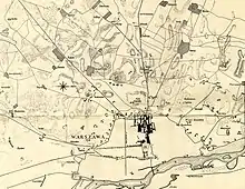The space between the large fortifications was covered by a series of smaller redans (chevron-shaped forts) and barkans (trapezoidal forts).[19] The strongest fortification in the outer line of defences was Fort 56 in the suburb of Wola, built around the St Lawrence's Church.[19][18] It was supported by Lunette 57 in front of it, and two forts (54 and 55) to the south of it. The headquarters was in Fort 73 between Rakowiec and the Jerozolimskie Gate.[20]