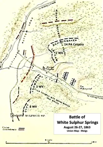 With the exception of the Union cavalry, the Battle of White Sulphur Springs was fought in West Virginia by West Virginia and Virginia units.[34] Some of the men from one of the Confederate units were from Greenbrier County, West Virginia, where the battle occurred.[35][36] Others were from adjacent counties such as Monroe and Mercer. Company G from 26th Virginia Infantry Battalion (a.k.a. Edgar's Battalion) came from White Sulphur Springs, and was known as the White Sulphur Rifles.[37]