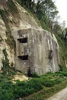On the official Belgian withdrawal from the Western Alliance, the Belgians refused to engage in any official staff meetings with French or British military staff for fear of compromising their neutrality. The Belgians did not regard a German invasion as inevitable and were determined that if an invasion did take place it would be effectively resisted by new fortifications such as Eben Emael.[14] The Belgians had taken measures to reconstruct their defences along their border with Germany upon Adolf Hitler's rise to power in January 1933. The Belgian government had watched with increasing alarm the German withdrawal from the League of Nations, its repudiation of the Treaty of Versailles and its violation of the Locarno Treaties.[15] The government modernised fortifications at Namur and Liège, and established new lines of defence along the Maastricht's-Hertogenbosch canal, joining the Meuse, the Scheldt and the Albert Canal.[15] Protection of the eastern frontier, based mainly on destroying a number of roads, was entrusted to new formations (frontier cyclist units and the newly formed Chasseurs Ardennais).[16] By 1935, the Belgian defences were completed.[16] Even so, it was felt that the defences were no longer adequate. A significant mobile reserve was needed to guard the rear areas, and as a result it was considered that the protection against a sudden assault by German forces was not sufficient.[16] Significant manpower reserves would also be needed, but the public rejected a bill to require longer military service and training was rejected on the basis that it would increase Belgium's military commitments, perhaps in conflicts far from home.[17]