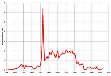 Wartime aluminum demand for airplane construction during World War II caused bauxite production to jump more than 16-fold from 1939 to 1943. In 1943, US bauxite production peaked at 6.3 million tons, then fell back to 1.0 million tons in 1945. The US has supplied less than ten percent of world bauxite each year since 1956, and less than one percent each year since 1982.