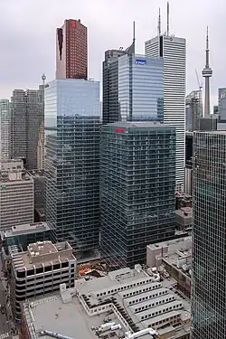The Bay Adelaide Centre is an office complex in the Financial District of Toronto, Ontario, Canada. The first phase, a 51-storey skyscraper known as Bay Adelaide West, was completed in July 2009. The second phase, the 44-storey Bay Adelaide East, was completed in October 2016.[2] A third tower, Scotiabank North Tower, opened in 2022 and serves the new global head office of Canadian bank Scotiabank.[3][4]