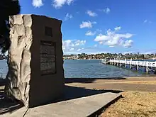 Bayview Park ferry wharf, and the namesake public park located adjacent to it, is built upon the site of the historical Burwood ferry wharf, which provided vital transport links from the region to Parramatta and the Sydney central business district in the early 19th century.[1] Burwood wharf is most significant for being the landing site of HMS Buffalo on 26 February 1840,[2] which carried 58 patriote exiles who fought against British colonialists in the Lower Canada Rebellion.[3][4] The prisoners, who were incarcerated at Longbottom Stockade, formerly located at the present site of Concord Oval, were pardoned four years later,[3][4] and policies pertaining to responsible government for which the Rebellions of 1837–1838 were fought, were eventually adopted in both Canada and Australia in the decades after the rebellions.[5][6] A memorial stone to commemorate the 130th anniversary of the landing of HMS Buffalo was originally erected at Cabarita Park in May 1970 by Concord Council, and dedicated by Prime Minister of Canada Pierre Trudeau. The memorial stone was moved to its current location adjacent to the wharf entrance following the development of the Bayview Park reserve in February 1984.[2] A similar memorial stone for the exiles of the Upper Canada Rebellion, who were also carried to Australia aboard MS Buffalo, was erected in Hobart, Tasmania.[7] The geographic features of France Bay, Exile Bay, and Canada Bay, were named in honor of the convicts and their landing at the present-day Bayview Park.[8]