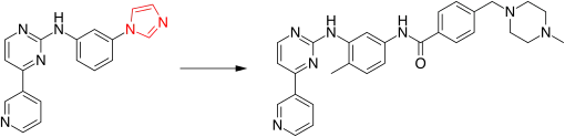 In the development of imatinib, the structure of Bcr-Abl tyrosine kinase played a limited role because it was unknown.[7] A high-throughput screening of chemical libraries at Novartis was performed to identify a starting molecule, which was called "Pyrimidine A". This compound served as a lead compound and was then tested and modified to develop imatinib.[9] With a replacement of the imidazole group with a benzamido group, the compound's specificity increased while its activity as a kinase inhibitor remained the same. Subsequently, introducing a methyl substituent ortho to the pyrimidinyl-amino group enhanced the potency.[4]