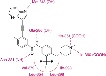 6 | Met-318, Thr-315, Glu-286, Asp-381, Ile-380, His-361 | Inactive | Drug screening | Marketed as first line therapy |