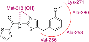The binding of substance 14 is partly similar to dasatinib, the aminothiazole segment of substance 14 makes a bi-dentate H-bonding interaction with the backbone CO and NH of Met-318 while the methoxy-benzene falls nicely into a hydrophobic pocket created by Val 256, Ala 253, Lys 271 and Ala 380.[35] Whilst the similar binding properties to those of dasatinib, suggests the possibility of producing Bcr-Abl TKI's from thiazole cores is real, the question remains open whether this research will just lead to a dasatinib analog or a novel way to inhibit TKs.