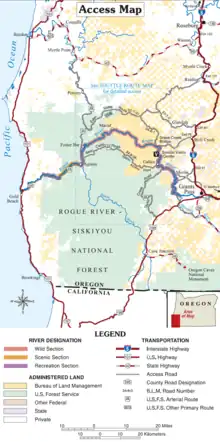 Bear Camp Road is a rugged mountain road traversing the Klamath Mountains in Josephine and Curry counties in the U.S. state of Oregon. Bear Camp Road is a combination of Bureau of Land Management (BLM) Road 34-8-36 (also known as Galice Road) starting just south of Galice and United States Forest Service (FS) Road 23, which continues from the 12-mile (19 km) point on 34-8-36 to Agness. The road is named for a camp and viewpoint at the 4,600-foot (1,400 m) summit near the Josephine–Curry county line.