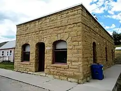 The bank building serves as a hub for the Bearcreek commercial district. When the nomination form was submitted in 2002 the building housed the town hall. Purchased by Bert Vaill and built by prominent area stonemason John Russell, it is a one-story Romanesque style with sandstone quarried just north of town. According to the site placard: "Symbolizing Vaill’s faith in Bearcreek’s future, the bank’s thick stone walls were also meant to assure customers that their money was safe from theft and bank failure, a tenuous assumption in the days before Federal Deposit Insurance."[3]