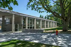 The museum includes a theatre and 20,000 square feet (1,900 square metres) of collections and exhibit space.[8] It is entered through the Mowafaghian Atrium, a glass-walled gallery two storeys tall which, in addition to the museum's gift shop and the Niche Cafe, houses the museum's signature piece: Canada's largest blue whale skeleton.[5] The display is a "see-through box" whose façade windows have "steel mesh brises-soleils". The museum lies parallel to one of the main walking routes of the university campus, was described in Exploring Vancouver: the architectural guide as "a perfect commission for architects known for creative restraint".[6] The whale is suspended over a descending ramp by which the collections are accessed.[6] The space also includes a "family zone" with juvenile reading materials and a teaching collection in a Discovery Lab.[9] Most of the collections are displayed in cabinet windows and shadow boxes, although a few are shown through alternative displays like in-ground "excavations" that under glass that visitors can walk on.[10]
