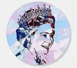 The spin painting was made using household gloss paint, on a circular canvas with a diameter of 152.4 cm (60.0 in). It has radial bands of pink and light blue on a white ground, overpainted with a portrait of the Queen in darker red and blue, reproducing a photograph. She is depicted in a three quarter view, slightly smiling, wearing the Girls of Great Britain and Ireland Tiara, familiar from the Arnold Machin series of British coins issued until 1984. The modernist, almost Pop Art, image is also reminiscent of Jamie Reid's cover of the Sex Pistols second single "God Save the Queen", released in 1977.