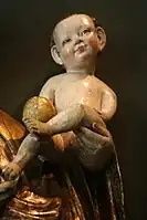 It shows Virgin Mary with naked Baby Jesus holding an apple. The Virgin stands in counterpose, her clothes are rich pleated.