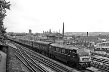 The first section of the Bristol and Exeter Railway's main line opened on 14 June 1841 between Bristol and Bridgwater.[15] The station at Bedminster, originally known as Ashton, opened in 1871,[16] on the site of an earlier excursion platform which had closed in about 1870.[10] Sited approximately 57 chains (1.1 km) from the Bristol & Exeter's northern terminus at Bristol Temple Meads and 119 miles 08 chains (191.7 km) from the Great Western Railway's London terminus at Paddington,[1] there were two tracks, both originally 7 ft (2,134 mm) broad-gauge, but the line was reconstructed as a mixed gauge line to accommodate local 4 ft 8+1⁄2 in (1,435 mm)-gauge traffic by 1 June 1875.[15] On 1 January 1876, the Bristol and Exeter was amalgamated into the Great Western Railway (GWR), who took over services. The station had been renamed Bedminster by 1884, when on 27 May the original station closed and a new station was opened some 14 chains (280 m) west.[1][16] There were two separate platforms, one on each side of the two tracks. Broad-gauge trains ceased operation on 20 May 1892,[15] and in 1908 the new station was extended, with the addition of ornate station buildings and a footbridge at the west end of the platforms.[10] Until the opening of Parson Street in 1927, Bedminster had served as the first station for trains heading for the Portishead Branch Line, which served the town of Portishead, the villages of Pill and Portbury, and the south side of the River Avon.[17]