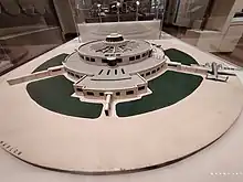 Architect's model, showing telescopic covered corridors deployed, on display in the Victoria and Albert Museum
