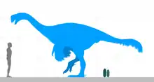 Beibeilong was one of the largest oviraptorosaurs. Its body size has been extrapolated from the large Macroelongatoolithus eggs associated with the holotype embryo.[1] It had an estimated adult length of about 7.5 m (25 ft),[3][4] with a body mass around 1.5–2 metric tons (1.7–2.2 short tons).[5][6] The dimensions of Beibeilong were only surpassed or approached by the closely related Gigantoraptor.[7]