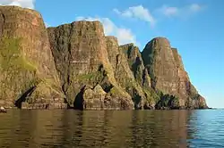 Beinisvørð (Beinisvord) is a 469 metres (1,539 ft) high sea cliff in Suðuroy, Faroe Islands, the highest sea cliff in Suðuroy.[1] It is located between the villages of Lopra and Sumba. Beinisvørð has vertical cliffs facing the sea and a green slope down towards the village of Sumba. The triangular top of Beinisvørð is visible from many places in Suðuroy, including Lopra, Nes and Marknoyri, the easternmost part of Vágur. In clear weather it is also visible from Smyril M/F just before she enters the fjord of Trongisvágur, Trongisvágsfjørður. Men from Sumba used to rappel down the steep mountain side of Beinisvørð on bird lines (it is called "síging"; one man hangs on a thick rope, while several men hold it at the top) in order to catch sea birds and to collect eggs. Both birds and their eggs were important food for the people of Sumba in the past. Several men have been killed while doing this; sometimes a stone fell on a man's head, fatally injuring him. In 1975 a big avalanche at Beinisvørð destroyed numerous bird habitats and landmarks.[2]