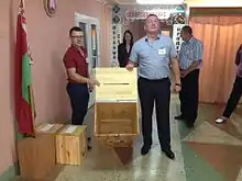 Members of a commission showing empty ballot box before its closure, Slutsk