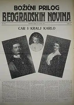 The Belgrader Nachrichten (Serbian: Beogradske Novine, lit. 'Belgrade News'), was the official occupation periodical of the Austro-Hungarian Military Governorate in Serbia during the First World War. As the main propaganda organ, the focus of the newspaper was to portray the occupation and its government as benevolent and working in the interest of the Serb population. It was published daily, in German, Serbo-Croatian and Hungarian from 1915 to 1918, during the occupation of Serbia.[1]