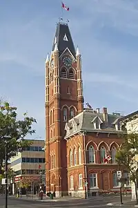 Built in 1873 as town hall and market by local architect John D. Evans, the High Victorian Gothic Revival was built using limestone and red brick.[1] It became city hall in 1877 when Belleville became a city.[2]