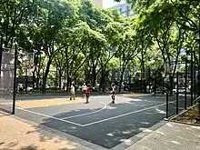 Construction of a $5 million renovation of the park began in May 2022, which includes the replacement of the south playground with an ADA-accessible dog run, reconstruction of the north playground and basketball court, and the installation of community gardens and additional lighting along the central plaza.[1][17] The improvements to the park came as a result of several years of discussions with local residents, a group of which specifically requested an accessible dog run and worked to have a temporary dog run opened in the park at the beginning of 2018.[18][19] Other community members wanted to improve the safety of the park by moving the adult fitness equipment away from the playgrounds and removing park benches to dissuade the homeless from loitering near the areas where children play.[20] The renovations to the park were completed in June 2023.[21]