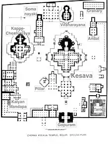The Chennakeshava complex at Belur consists of a 443.5 feet by 396 feet court with several Hindu temples and minor shrines inside a walled compound.[23][note 1] The compound is entered from the east through a Gopuram added during the repairs of the Vijayanagar empire era.[24] The temples and monuments found inside the walled complex are:
