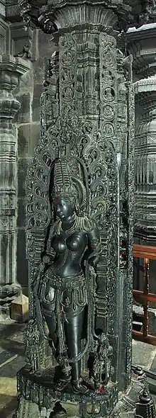 In the center of the hall is a large open square, above which is a domed ceiling about 10 feet in diameter and 6 feet deep.[53] At the top is a lotus bud with Brahma, Vishnu and Shiva carved on it. At the bottom of the dome is a series of friezes with the Ramayana story.[53] On the capitals of the four pillars are madanikas (Salabhanjika). One represents dancing Saraswati, the Hindu god of knowledge, arts and music. The others are regular dancers, but with different expressions. One is dressing her hair, the other in a Natya posture, and the fourth has a parrot seated on her hand. The head and neck jewelry made of rock are freely mounted and can be moved. The bracelets similarly are moveable.[53] The design of the ceiling follows the Hindu texts, and is a modified utksipta style with images placed in concentric rings.[15]