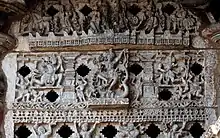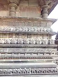The fifth carved band is of small figurines, mostly females with various expressions facing the viewer, while periodically the band includes Yakshas who face towards the inside of the temple. This layer also has numerous dancers and musicians, as well as professionals with their tools.[38][39] The band above has pilasters between some of which are carved secular figures mostly females and couples. A nature and creepers band wraps the temple above the pilaster band, with scenes of the Ramayana epic included in this band. Above this layer are scenes from common life depicting kama, artha and dharma. Included here are couples in courtship, eroticism and sexual scenes, followed by couples with children, economic and festive activities.[38] Towards the north outer wall, friezes with scenes from the Mahabharata are portrayed.[38]