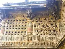 - The original temple was without boundary wall. The main mandapa was also open for the devotees to view and appreciate the intricate carvings inside the temple. For security of the temple, a high wall was constructed around the temple, a wood-and-brick gateway and doors added by Somayya Danayaka during the rule of Veera Ballala III (1292–1343), as well as the open mandapa was covered with perforated stone screens. The new screens darkened the inside of the temple making it difficult to see the artwork but allowed enough light for the darshana of the garbha griya.[19][20]