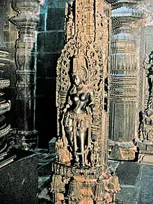 The navaranga hall has forty eight pillars. All except the central four are carved in a unique way. The central four are later additions, added in 1381 CE during the Vijayanagara Empire era, to support the internal structure of a damaged temple.[48] The pillars are of three sizes. Two pillars are particularly notable. One is the so-called Narasimha pillar which is carved with miniature figures from top to bottom, such as a tiny bull (kadale basava).[48] The local legend states that this pillar once could rotate because of how it was supported, but it no longer can be rotated.[48] The other pillar is the Mohini pillar.[51] Other than the female avatar of Vishnu, the pillar has eight bands of carvings, including those of Brahma, Vishnu, Shiva, then ten avatars of Vishnu, the eight direction deities, mythical animals with the body of a lion but the face of other wildlife.[48] The four central pillars are notable for having been hand carved while the others were lathe turned.[52]