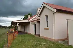 The passenger station comprises a central brick pavilion enclosing two waiting rooms and a ticket office for the Station Master, flanked by freestanding brick pavilions for the lamp room at the north end and toilets at the south end. The small yards between the pavilions were enclosed with corrugated iron screen walls and roofs. Each of the rooms was accessible from the 264 feet (88 m) long platform on the eastern side. A platform awning over the central portion across the width of the central pavilion provided shelter for passengers and platform equipment.[5][1]