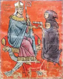 De septem sigillis survives in a single illustrated manuscript in Beneventan script kept at La Cava (Cavensis 18). It may be Benedict's autograph. It contains a miniature, perhaps also by Benedict himself, depicting the author handing a copy of his work to his abbot, who is depicted mitred and seated on a chair. The author is depicted advanced in age with a younger man's head imposed above him. This single double-headed figure is probably intended to represent the author when he began and when he finished. De septem sigillis is the product of a lifetime.[1] The caption identifies the abbot as Balsamon.[4]