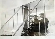 While waiting to repair the airplane, the Signal Corps decided to seek a more favorable climate location for flying during the winter. Foulois was directed to report to Fort Sam Houston in San Antonio, Texas, where he was directed by CSO Allen to "teach yourself to fly."[11] He did so, and at 9:30 a.m. on March 2, 1910, on the Arthur MacArthur parade field made four flights on S.C. No. 1, which included his first solo takeoff, first solo landing, and first crash.[12] Over the next 15 months, Foulois modified S.C. No. 1's elevators at the instructions in correspondence from Orville Wright, and demonstrated the use of the Wright B aircraft for aerial mapping, photography, and reconnaissance, and the use of the radio while airborne. To end the requirement of using a 60-foot launch rail to take off, he drew up plans for and installed wheels in place of skids, and equipped the S.C. No. 1 with the first seat belt, using a four-foot leather cinch obtained from the cavalry saddlery.[13] According to Foulois: "The second flight I made after crashing the first time I took it up I got almost thrown out; landed; the artillery officer came up there and I told him, Fred, I wanted to get a belt to keep me in that damn plane. He said, whaddya want? and I said a strap about four feet long, something I can lash myself to the seat with. That was the first safety belt invented."[14] As the result of repeated crashes and repairs, many caused by Foulois being "ground shy" (the result of his having no formal training in landing an airplane), S.C. No. 1 became unflyable, and in February 1911 the Army leased a Wright Model B from Robert Collier. Because Foulois was unfamiliar with the type, the Wright Company sent Philip O. Parmalee to instruct.