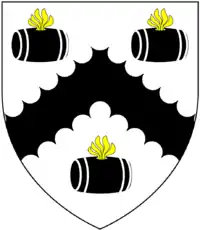 Arms of Incledon of Incledon and Buckland in the parish of Braunton, North Devon: Argent, a chevron engrailed between three tuns sable fire issuing from the bung hole proper.[1]Canting arms "incend-tun"