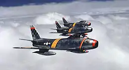 In 1949, Davis attended Air War College.[1] He later served at the Pentagon and in overseas posts over the next two decades. Noteworthy is that during his time at the Pentagon, he drafted the staffing package and gained approval to create the Air Force Thunderbird flight demonstration team.[14] He again saw combat in 1953 when he assumed command of the 51st Fighter-Interceptor Wing (51 FIW) and flew an F-86 Sabre in Korea. He served as director of operations and training at Far East Air Forces Headquarters, Tokyo, from 1954 until 1955, when he assumed the position of vice commander of Thirteenth Air Force, with additional duty as commander of Air Task Force 13 (Provisional), Taipei, Taiwan. During his time in Tokyo, he was temporarily promoted to the rank of brigadier general.