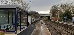 Timetable posters and digital information screens on both platforms provide train running information, whilst there are waiting shelters on each side. The stone shelter on the westbound platform was constructed by the Midland Railway, whereas its counterpart on the opposite platform is much more modern in comparison.[12][13]