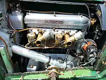 The 3.0 L (2,996 cc or 183 cu in) straight-4 engine was designed by ex-Royal Flying Corps engineer Clive Gallop[3] and was technically very advanced for its time. It was one of the first production car engines with 4 valves per cylinder, dry-sump lubrication and an overhead camshaft. The four valve SOHC Hemi design, with a bevel-geared shaft drive for the camshaft, was based on the pre-World War I 1914 Mercedes Daimler M93654 racing engine.[4] Just before the outbreak of the war Mercedes had placed one of the winning Grand Prix cars in their London showroom in Long Acre. At the suggestion of W.O. Bentley, then being commissioned in the Royal Naval Air Service, the vehicle was confiscated in 1915 by the British army, dismantled at Rolls-Royce and subjected to scrutiny.[5][6][7] A notable difference to both the Mercedes and the aero engines was the cast-iron monobloc design, and the fully Aluminium enclosed camshaft, which greatly contributed to its durability. But having the valve-head and block in one-piece made for a complicated and labour-intensive casting and machining.[8] This was a feature shared during that time by the Bugattis which the car was later to compete with. The engine was also among the first with two spark plugs per cylinder, pent-roof combustion chambers, and twin carburettors. It was extremely undersquare, optimized for low-end torque, with a bore of 80 mm (3.1 in) and a stroke of 149 mm (5.9 in).