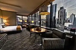 The 21-story hotel, converted from an office building in 1998, has 197 rooms, as of 2010.[1] Many rooms offer views of the East River and Queensboro Bridge.[2][3] New York magazine's Nick Divito described the hotel as "a former high-rise office building that's been converted into a beacon of contemporary and surprisingly comfortable style. Think bright lights, boxy leather sofas and brushed-steel side tables."[4]