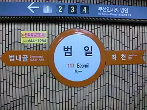 Beomil Station (Korean: 범일역; Hanja: 凡一驛) is a station of the Busan Metro Line 1 in Beomil-dong, Dong District, Busan, South Korea. The station is unrelated to the Beomil Station of Korail.