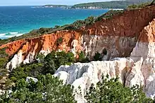 The park consists of two sections, on either side of Twofold Bay and the town of Eden. The smaller northern section is bounded on its western border by the Princes Highway. The geology of this section is mainly sedimentary rock (ironstone and clay) laid down in the Paleogene, with some quartzite outcrops. The main attraction for tourists is the Pinnacles, a multicoloured erosion gully with white sands overlaid by rusty red clay. The southern section coastline is metamorphic and Devonian in age, with some heavily folded sections at Red Point, near Boyd's tower.[14]