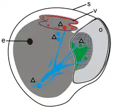 ![]() Dorsal view of an early juvenile stage (30% of development). Scale bar is 100 μm. j = juvenile of Berghia stephanieae is crawling out of the shell and marking the end of the metamorphosis. pp = elaborated larval foot (propodium), e = eyes, s = shell. |