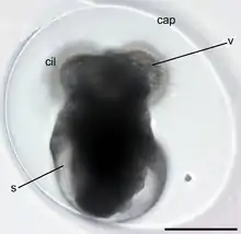 ![]() Dorsal view of veliger stage larva (12% of development). Scale bar is 100 μm. e = eyes, pp = elaborated larval foot (propodium), s = shell, v = ciliated velum, cap = the capsule that surrounds each embryo. |