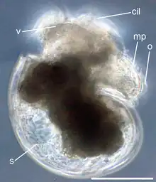 ![]() Lateral view of hatched larva (20% of development). Scale bar is 100 μm. o = operculum, mp = metapodium to where is the operculum attached at, cil = cilia, s = shell, v = ciliated velum. |