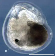![]() Lateral view of retracted and settled larva in metamorphosis (25% of development). Scale bar is 100 μm. e = eyes, cil = cilia, s = shell. |