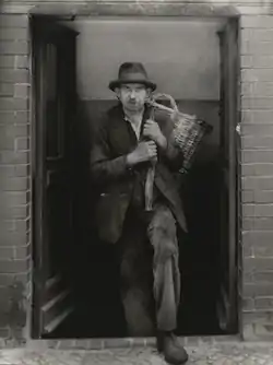 The photograph depicts a coal carrier from Berlin, emerging from the dark cellar of a building into the sunlight. The man of middle age and with a moustache, is of humble social condition, he wears a hat and is dressed poorly, with dirty and worn pants. He takes a step upward the door, while he carries on his left shoulder a wicker basket, presumably with coal. His appearance and profession put him at the lower ranks of the working class of the Weimar Republic. The J. Paul Getty Museum website states: "His place, Sander seems to suggest, is deep inside the bowels of German society — like the dark basement from which he emerges."[2]