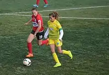 Berna Yeniçeri (left) playing for Konak Belediyespor against Kireçburnu Spor in the 2015–16 season's away match.