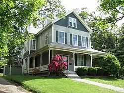 The Bernard Cogan House stands north of Stoneham's Central Square, on the south side of Flint Street, near its junction with Main Street (from which it is separated by a two-level parking garage). It is a 2+1⁄2-story wood-frame structure, set on a lot lined at the sidewalk by a low fieldstone retaining wall. The house is a basically rectangular plan with off-center entry, and a cross-gable roof section near the back of the house, where there is a projecting section. There is a porch that wraps around the front of the house to the left side where it runs to the projection. The porch has turned pillars, a decorative valance, and decorative railings. The walls are covered in sections of clapboard, decorative cut shingles, and vertical paneling.[2]