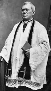 Donnelly immigrated to the United States in the late 1830s, first settling in Philadelphia where he worked as a teacher.[4] In 1840 Donnelly enrolled in St. Mary's of the Barrens Seminary with the intention of serving as a Roman Catholic priest for the Irish community in the United States.[5] Fr. Donnelly was ordained a priest in 1845 by Peter Richard Kenrick, (1806–1896) Archbishop of St. Louis.[6] He was assigned to St. Mary's Parish in Independence, Missouri where he earned the nickname "the Pioneer Priest".[7] He also served as a priest to the French community living at the confluence of the Kansas and Missouri rivers established by François Chouteau (1797–1838) in 1821.[8] Their parish, St. John Francis Regis, was founded as a log cabin church in 1835.[9]