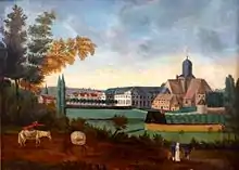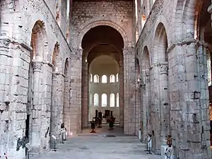 The abbey archives are lost and so the next period of the abbey's history is unclear. The monks certainly profited from their town's prosperity after it became a textile and financial centre in the 12th century. In 1249 a major fire destroyed part of the monastery, reducing it from 35 to 15 monks.[1] In the 15th century the abbey church's north nave aisle and apse were rebuilt in the Gothic style.[4] In 1563, Gaspard II de Coligny sacked the abbey and looted its treasures and archives and it was further damaged by the rural Gauthier uprising in 1589. It was then left almost deserted until 1618, when the cloister was rebuilt.[1] From 1628 it was taken on by the Mauristes, who began major building works in 1686. The refectory dates to 1694.[1] The works also demolished the church's two westernmost bays and two eastern apse chapels.[4] A new classical façade replaced the church's original one[7] and most of the capitals in the nave were plastered in stucco. The central tower was also heavily reworked.