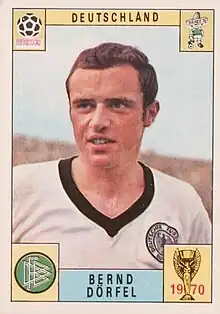 Dörfel represented West Germany 15 times, including UEFA Euro 1968 qualifier against Albania, 1970 FIFA World Cup qualifiers against Austria (twice), Scotland and Cyprus and ten friendlies.[2] He was not selected to the 1970 FIFA World Cup final squad because of his poor form in the 1969–70 season.