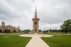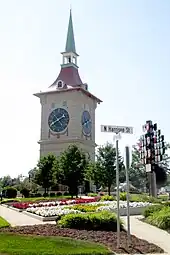 The idea of building the clock tower and plaza was first raised in 2001 while the city of Berne was planning for its sesquicentennial. Wanting to celebrate the city's Swiss heritage, it was decided to model the clock tower after the medieval Zytglogge in Bern, Switzerland, the oldest monument in that city (built c. 1220, repaired in 1405). The clock tower and plaza were given the name Muensterberg (Münsterberg) after the small Mennonite community in the Jura Mountains of Switzerland that Berne's first immigrants came from.[8] After several years of careful planning and fundraising, the clock tower was constructed in 2010. It stands 160 feet tall and 32 feet wide, weighing approximately 1,216 tons (over 2.4 million pounds).[61] It contains carillon bells created by the Verdin Company, which ring on the hour. Local enthusiasm for the project reached its peak during the summer of 2012 when the splash pad was first made operational in the center of the plaza. As early as the summer of 2009, however, several residents were heard to publicly declare their admiration for and dedication to the clock tower, and soon afterward the Clock Tower Enthusiasts Club was formed.