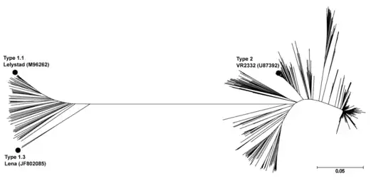 PRRSV is subdivided in two major types, the European (also known as Type 1) and the North American (also known as type 2).[24] Prototype sequences for each PRRSV type have been defined. For the European PRRSV, this is the Lelystad virus (LV), while for the North American PRRSV, this is the VR-2332. The European and North American PRRSV strains cause similar clinical symptoms, but represent two distinct viral genotypes whose genomes diverge by approximately 40%, thus creating a veil of mystery about the origin of this virus. It was suggested that the emergence of these distant types of PRRSV was a result of two independent evolutionary events.[33] To accommodate the clear divergence of the Type 1 and Type 2 PRRSV, they were split into two separate viruses.[34]